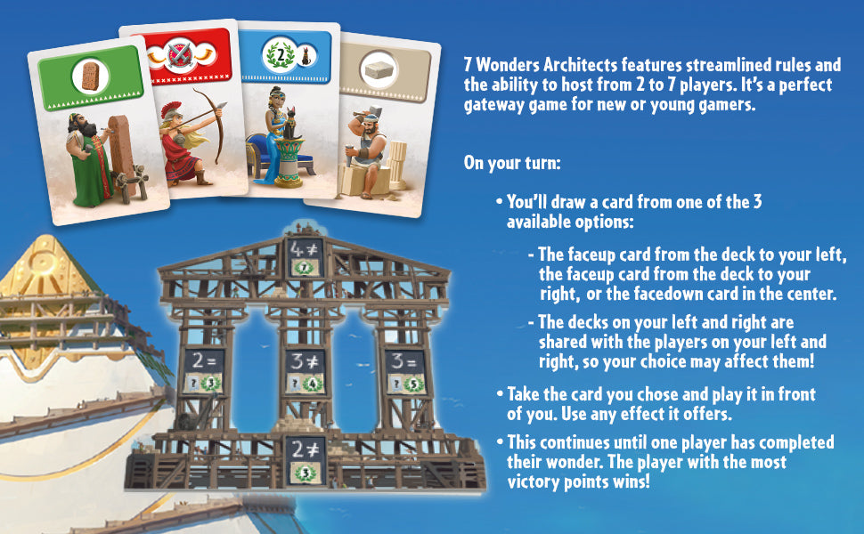 - HOST EPIC GAME NIGHTS: Designed for 2 to 7 players, 7 Wonders Architects is an ideal gateway game that guarantees memorable game nights.