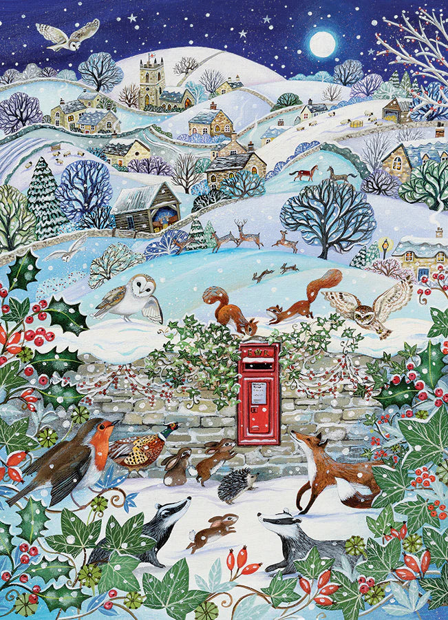 Gather 'round for some winter fun! Get lost in Village on a Winter Night, a 1000-piece snowscape of a cozy village ready for whatever adventures you can imagine! From snowball fights to secret meetings in the moonlight, your creativity is the only limit! Who knows what exciting surprises the village holds in store? The owls, squirrels, fox and birds gather at their mailbox meeting spot for some fun. Won't you join them?