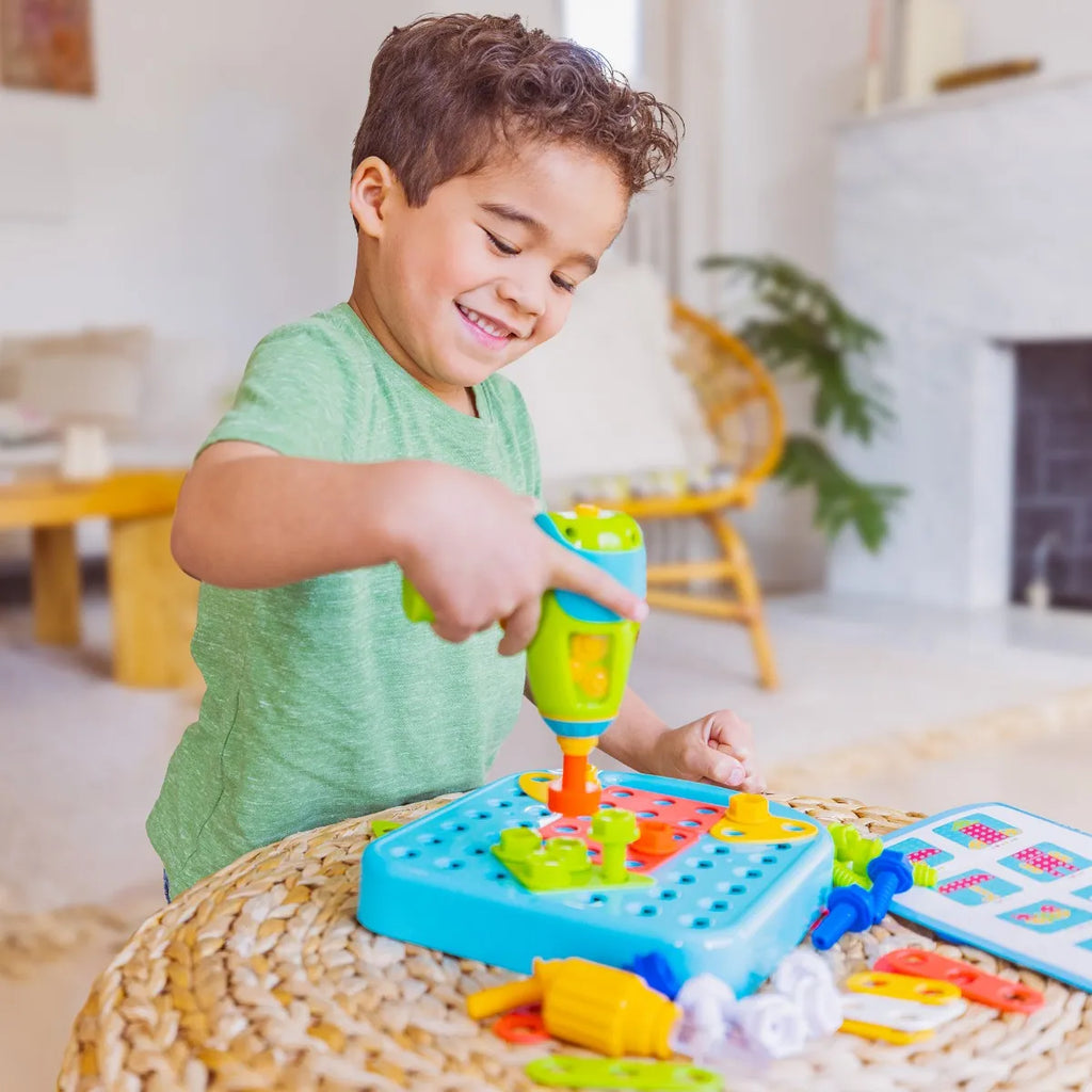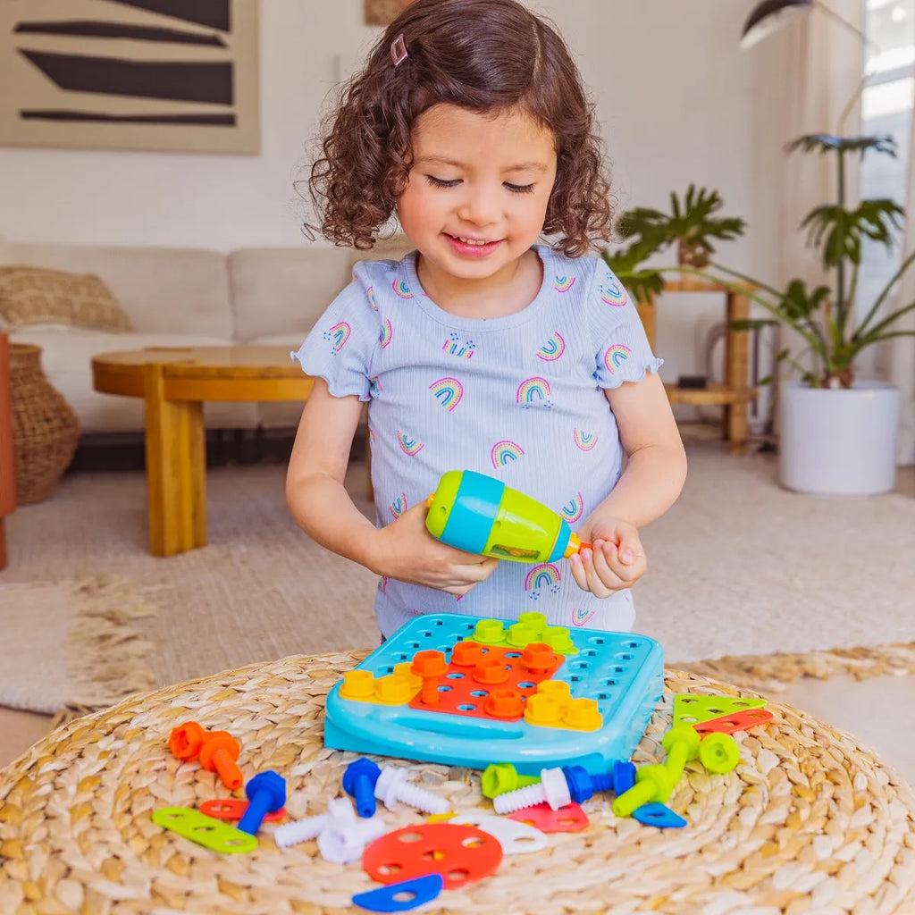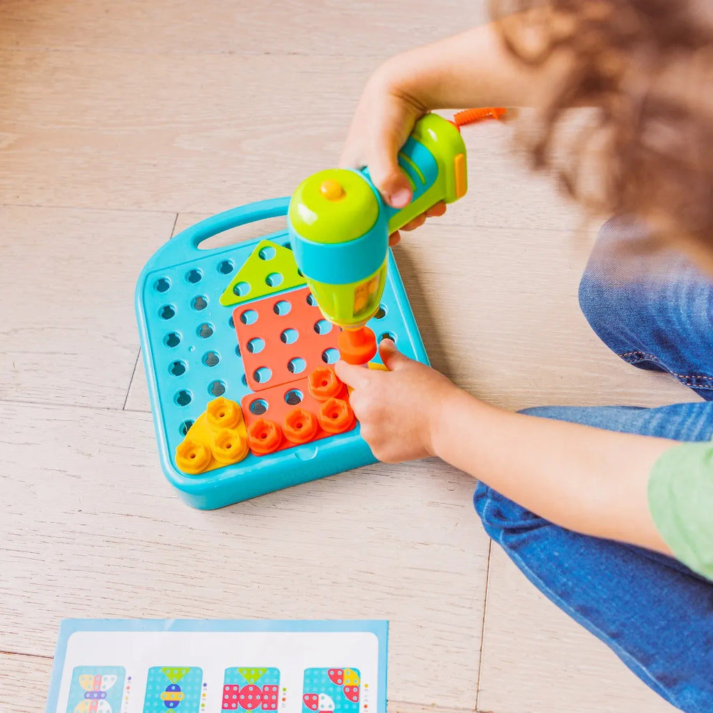 - Kids drill set - Busy builders use a kid-friendly power drill toy, decorative design plates, and matching bolts to create colourful works of art