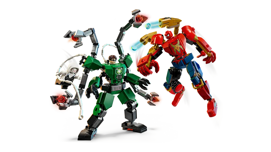 - LEGO® BATTLE ACTION AND ACCESSORIES – The building toy features 2 web ropes, 2 stud shooters for the Iron Spider mech, 4 jointed tentacles for the Doc Ock mech and 2 slings for Ghost-Spider