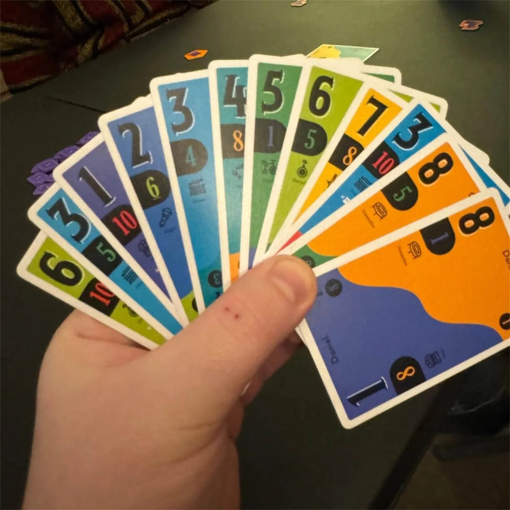 More specifically, cards are dual-indexed, with different values on each half of the card, with the 45 cards having all possible combinations of the numbers 1-10. During set-up, whoever is shuffling the cards should randomize both the order of the cards in the deck and their orientation. Once each player has been dealt their entire hand of cards, they pick up that hand without rearranging any of the cards; if they wish, they can rotate their entire hand of cards in order to use the values on the other end of each card, but again they cannot rearrange the order of cards in their hand.