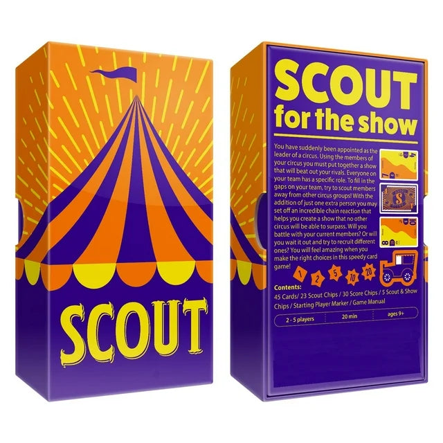 SCOUT is a ladder-climbing game in which cards have two potential values, players may not rearrange their hand of cards, and players may pass their turn to take a card from the current high set of cards into their hand.