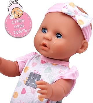 DRINKS & WETS: Feed Tiny Tears water from her very own bottle, sit her up and she will cry real tears or put her on her potty and she will wet… just like a real baby.