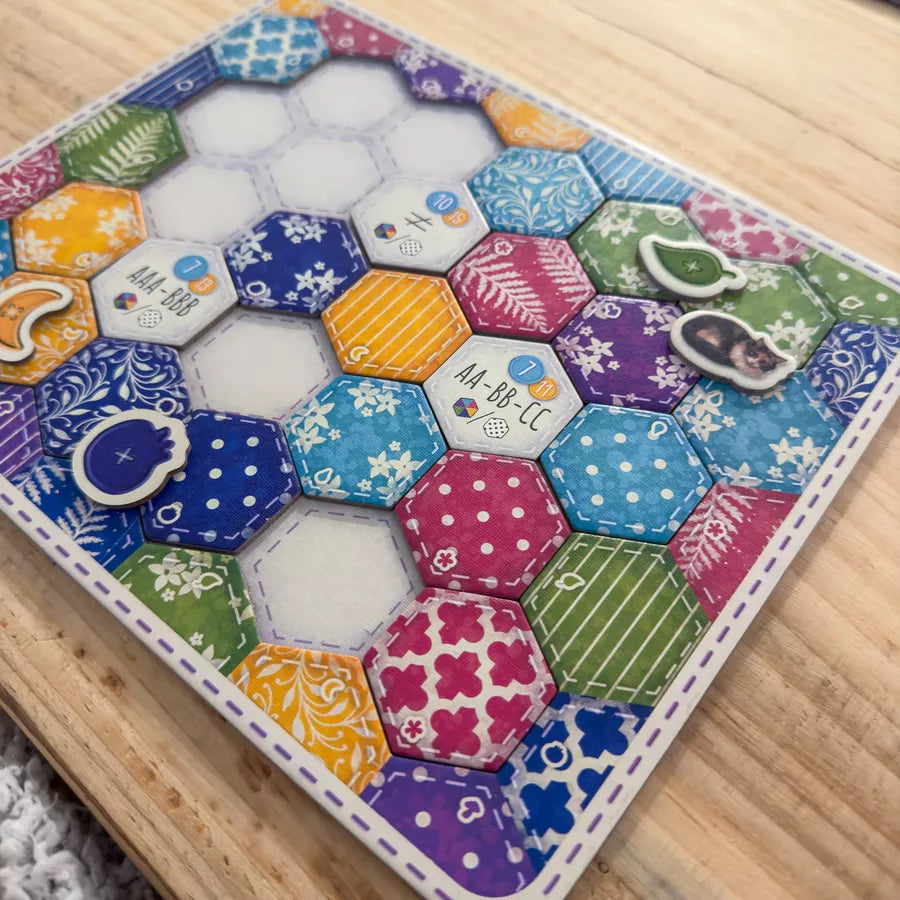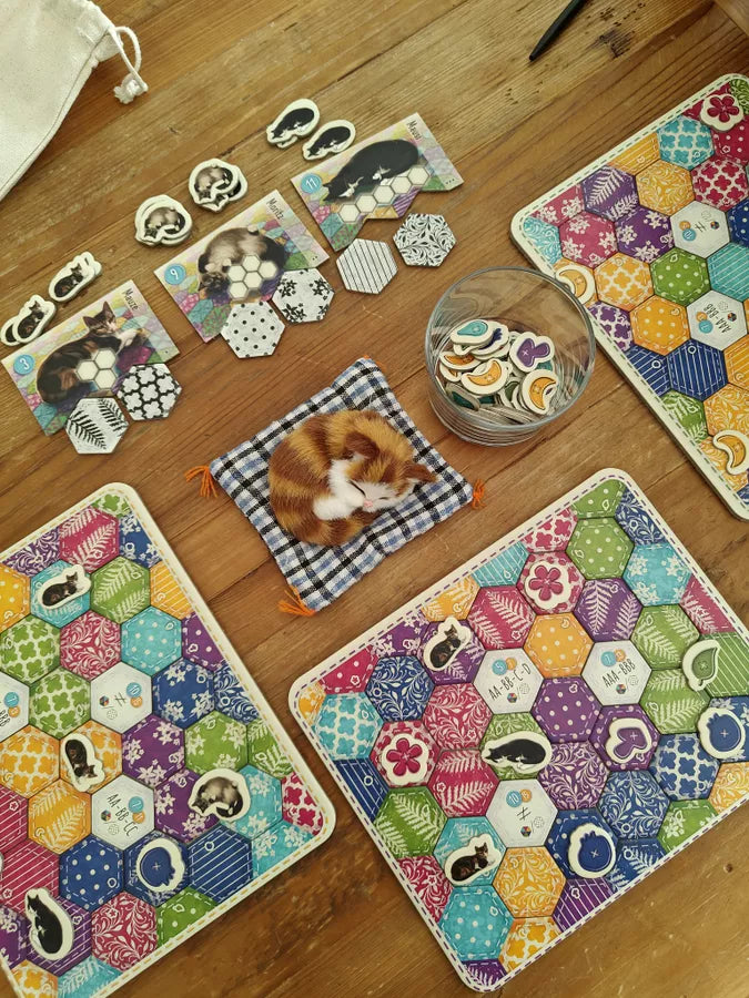 Turns are simple. Select a single patch tile from your hand and sew it into your quilt, then draw another patch into your hand from the three available. If you are able to create a colour group, you may sew a button onto your quilt. If you are able to create a pattern combination that is attractive to any of the cats, it will come over and curl up on your quilt! At the end of the game, you score points for buttons, cats, and how well you were able to complete your unique quilt pattern.