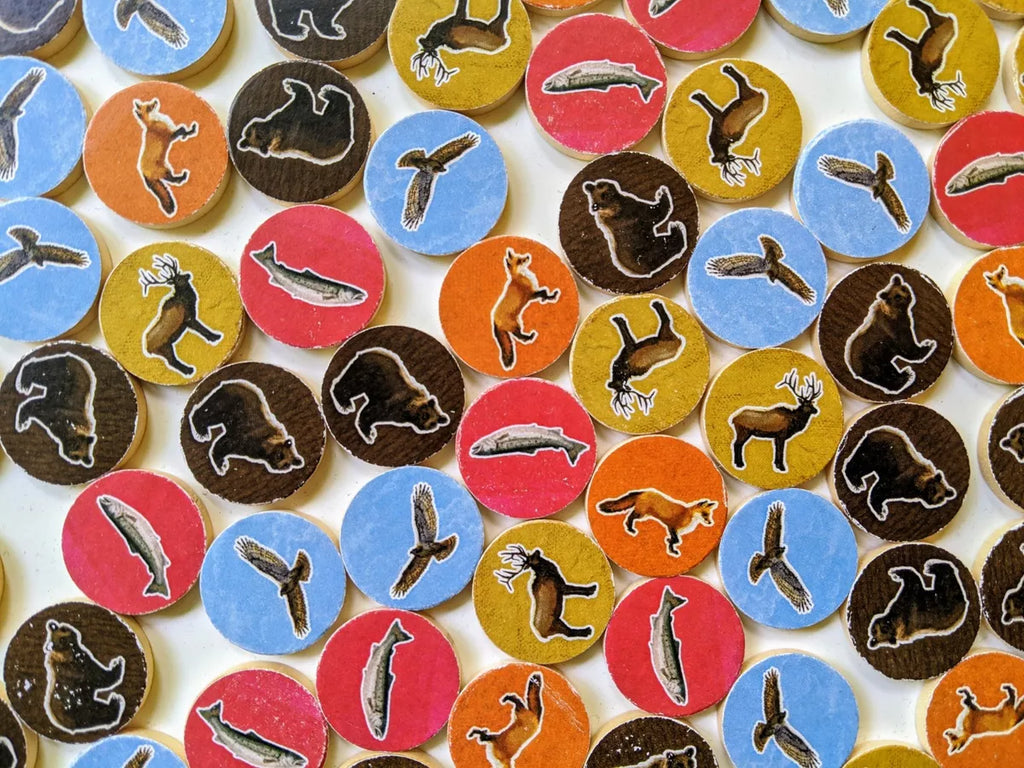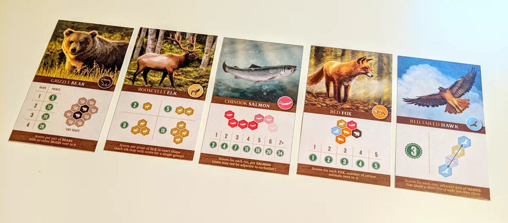 Ideally you can place habitat tiles to create matching terrain that reduces fragmentation and creates wildlife corridors, mostly because you score for the largest area of each type of habitat at game's end, with a bonus if your group is larger than each other player's. At the same time, you want to place wildlife tokens so that you can maximize the number of points scored by them, with the wildlife goals being determined at random by one of the four scoring cards for each type of wildlife. Maybe hawks want to be separate from other hawks, while foxes want lots of different animals surrounding them and bears want to be in pairs. Can you make it happen?