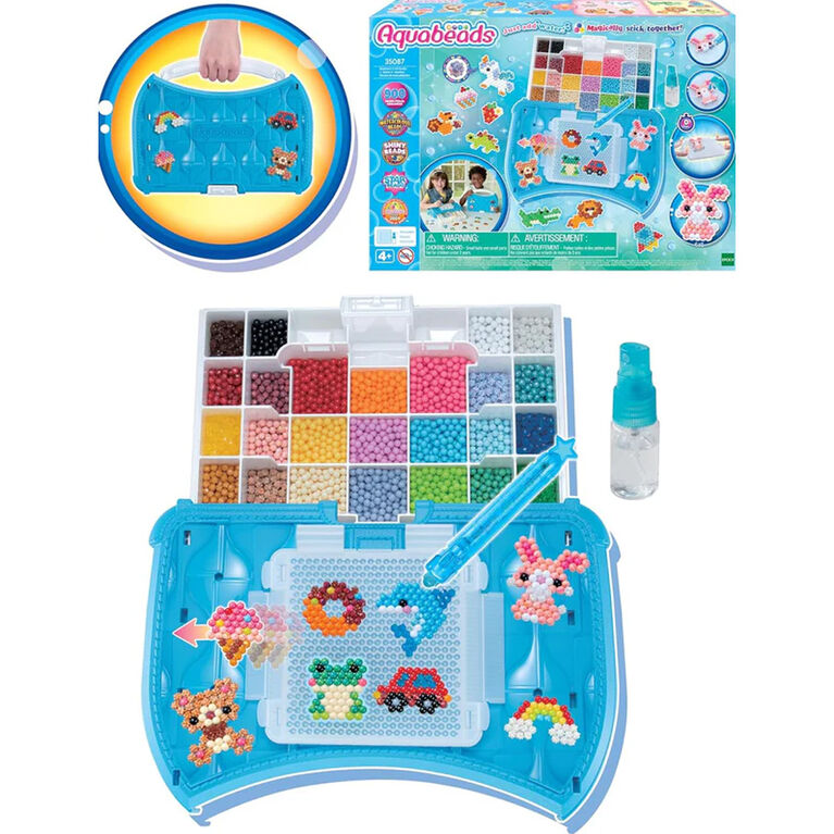 Aquabeads Beginners Craft Studio is the ideal introductory fuse bead set, allowing for independent play by children that doesn't require needles or ironing! This complete craft kit includes everything your child needs to create unique bead designs, from cute animals to colorful rainbows and candy confections. Set features over 900 solid, jewel, star and NEW watercolor beads in a variety of vibrant colors, innovative flip tray, sprayer, double-sided bead pen, creation base and bead palette that doubles as a storage case. To start crafting, select your template and place the sheet underneath the flip tray, aligning the beads to the spacing on the tray. Follow the template to place the beads on the tray until the template is covered. Spray with water to fuse the beads together and finish your design! Fill the sprayer with water and spray the design thoroughly. Immediately after spraying, flip the tray to transfer the design to the receiver for drying. Continue to create more bead designs quicker with the flip tray set! Keep expanding your Aquabeads collection with theme refills and bead refills. Visit aquabeadsart.com for more templates, including fun themes & seasonal designs. For children ages 4 and up. Not suitable for children under age 3 due to small parts.