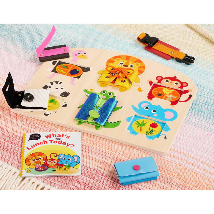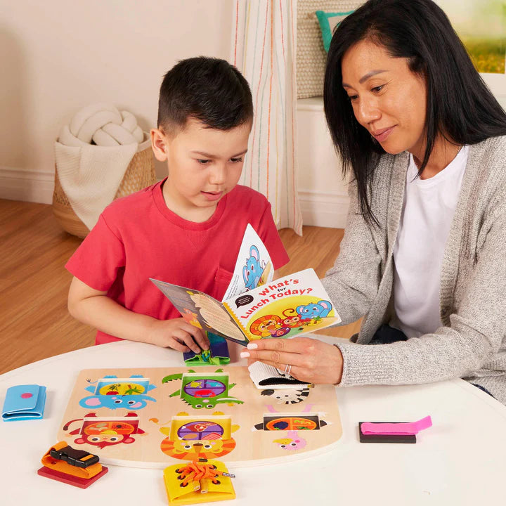 Zip! Pop! Snap! Practice using fun fasteners and discover animals’ diets with Battat Education’s “What’s in My Tummy?” With 6 common fasteners to do and undo, this activity board is great for little ones learning self-dressing skills—they can build fine motor skills and hand-eye coordination along the way too! Plus, as kiddos play with the activity board, they’ll discover diverse textures like fuzzy fabric and smooth plastic and build tactile skills. And there’s more fun under the blocks—remove ‘em to find out what each animal likes to eat! This basic skills board is a great educational tool for teaching little ones what herbivores, carnivores, and omnivores eat. They can even swap the blocks of animals with the same diet! Learn more about the animals’ lunches in the playbook’s story, then flip to the end to find educational play ideas.