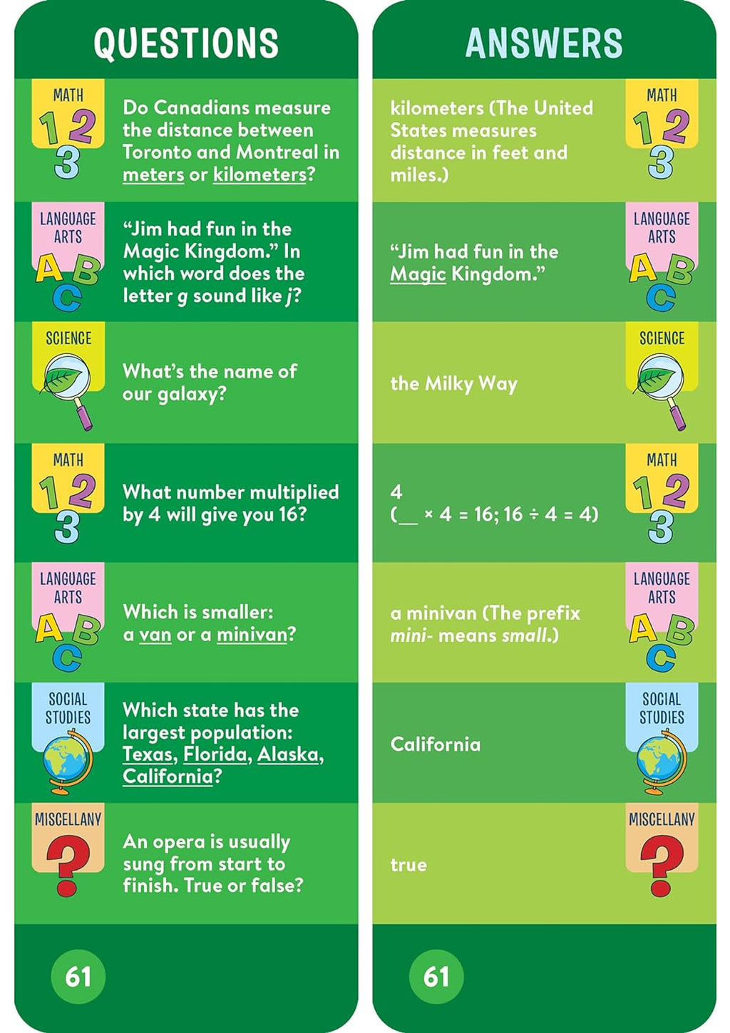 Brain Quest 3rd Grade Smart Cards helps kids aged 8 – 9 to learn core classroom subjects in a smart, entertaining, and engaging way. It’s a Q&A game that third graders can play with friends, family, or against the clock to test their knowledge. Smart cards feature hundreds of questions with answers to help kids know exactly what they need to know, when they need to know it.