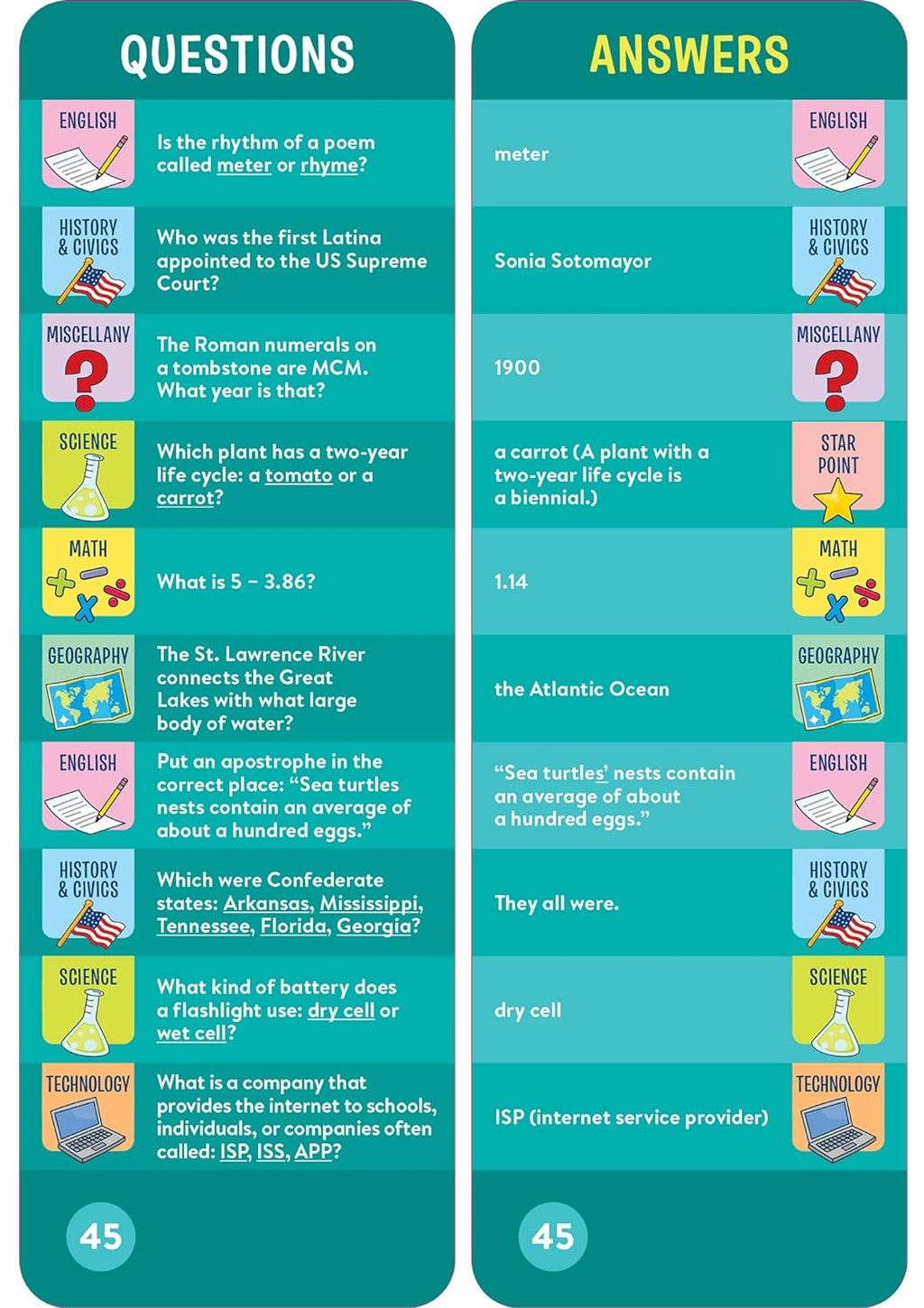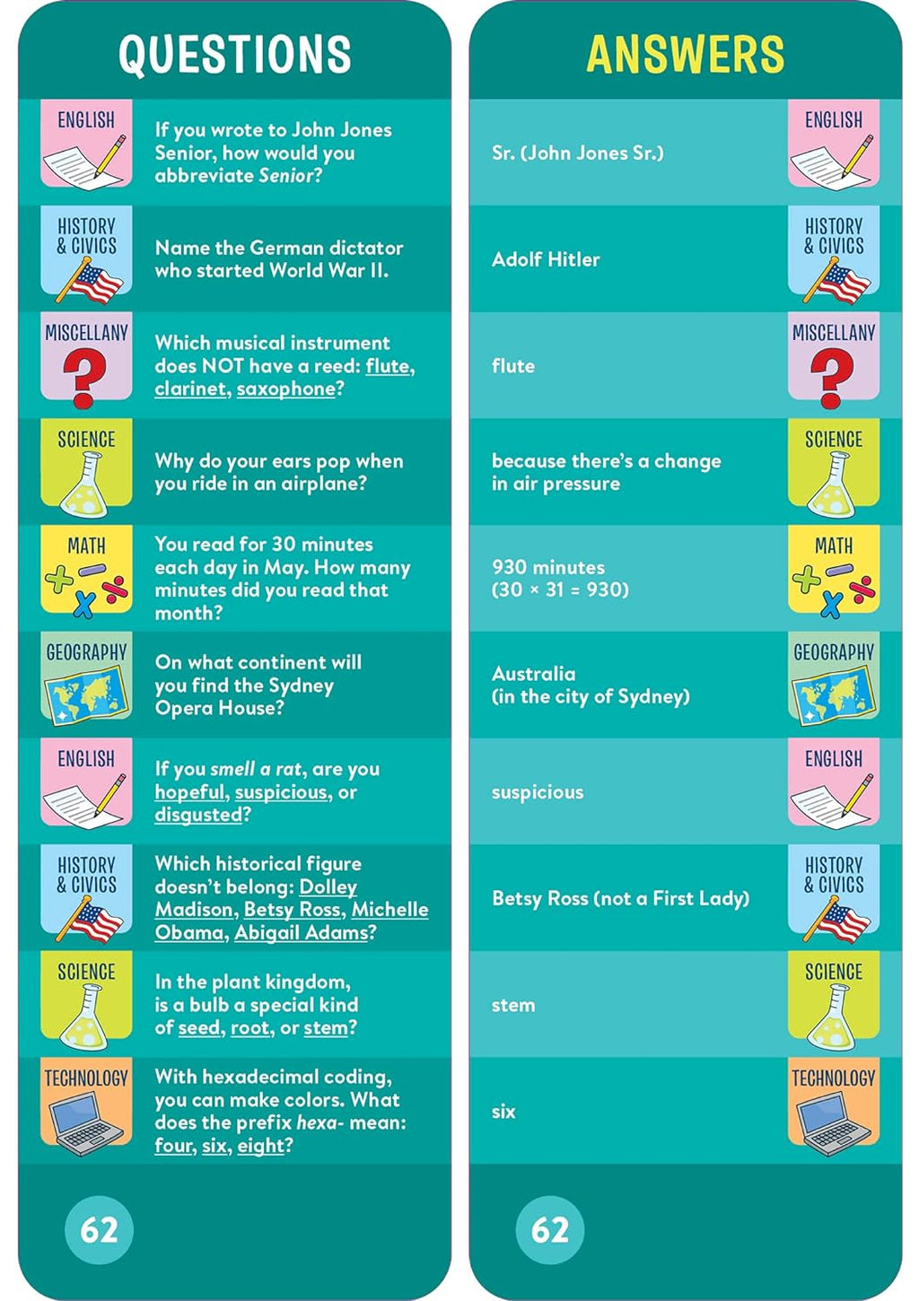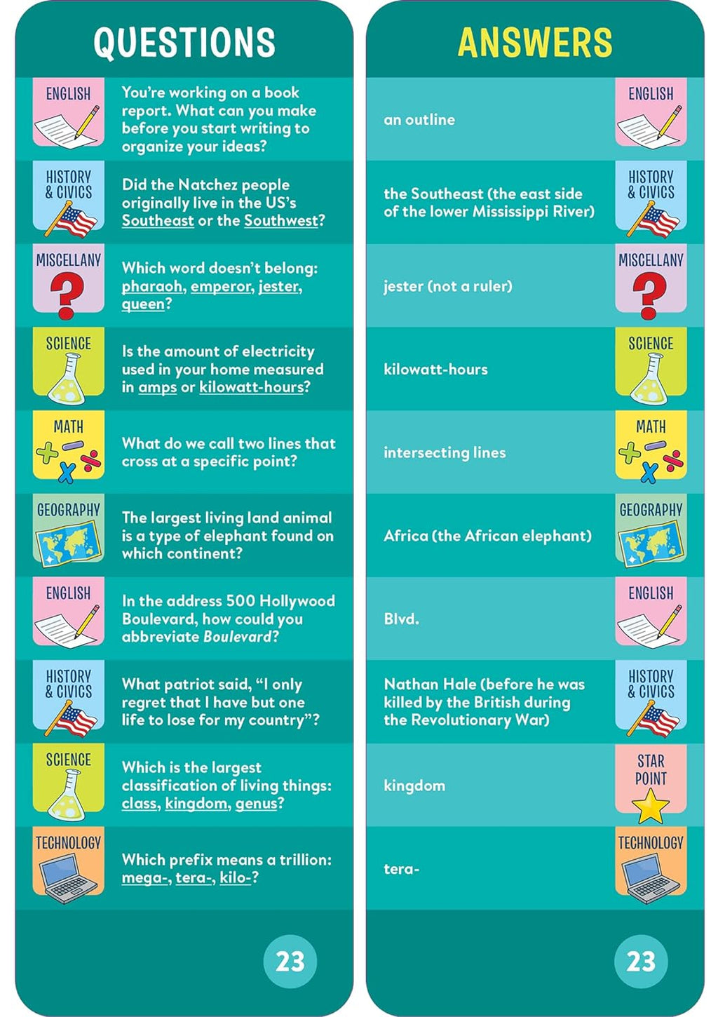 - 1,500 questions and answers covering math, science, English, History, Geography, and more