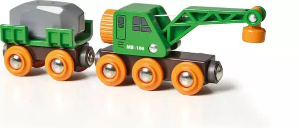 The clever crane wagon always gets the job done. With a retro orange and green design this crane can load the heavy boulder onto the waiting wagon. Now it's time to leave the quarry and get the load to it's destination. This item includes 1x Crane wagon, 1x Wagon, 1x Boulder and measures 15.1 x 3.4 x 5cm