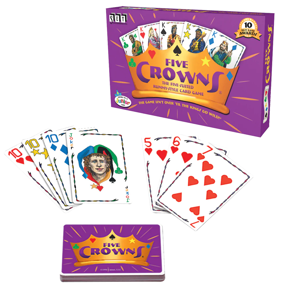 Five Crowns is rummy with a five-suited deck and a twist. The set collection aspect of rummy is basically the same, with groups of three cards in either runs or denominations making a valid meld. The twist is that in each hand the number of cards required to create a meld increases, from three cards in the first hand to thirteen in the last. The game, therefore, consists of eleven hands.