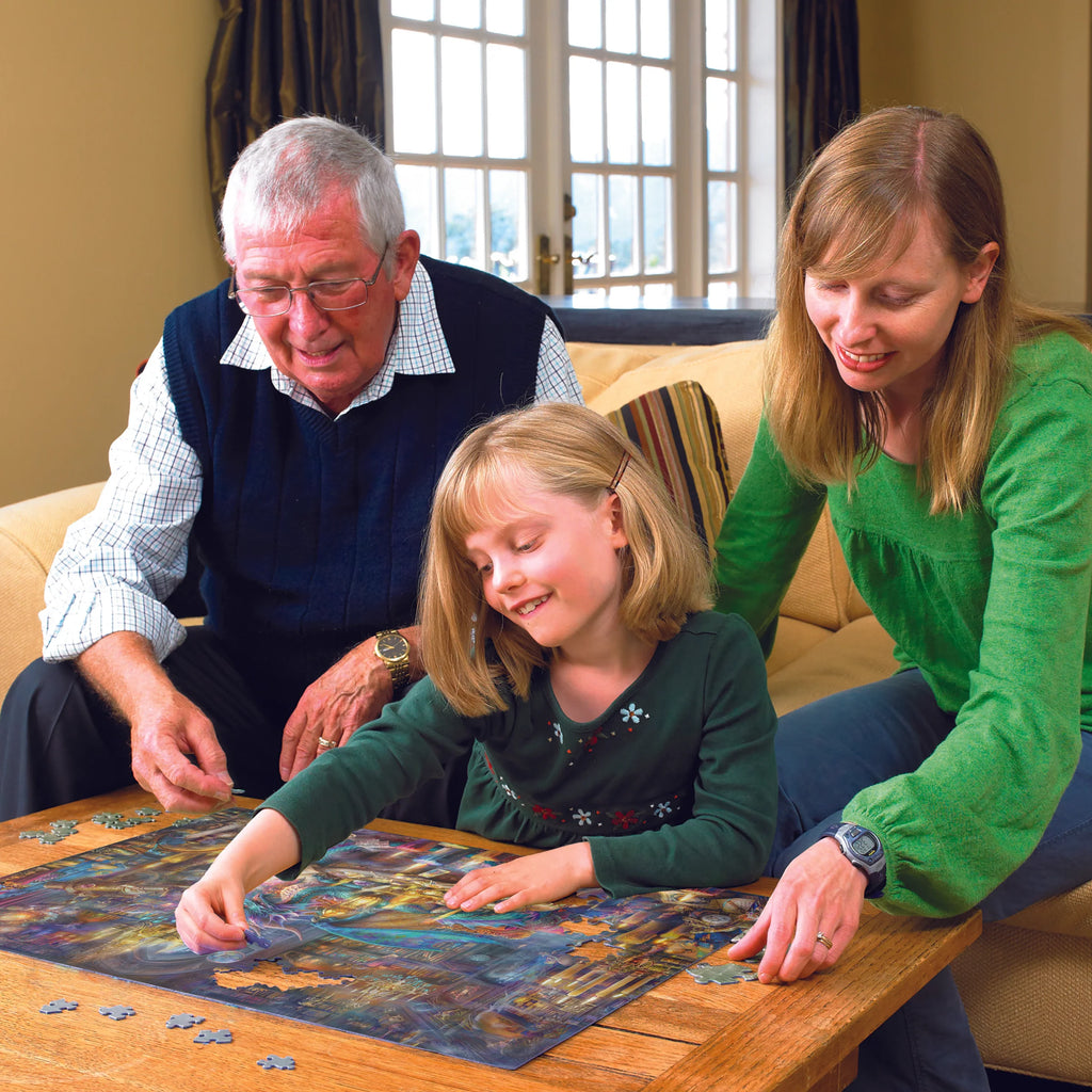Family Pieces 350 puzzles include three different piece sizes so puzzlers of all skill levels can collaborate. The large pieces are on one end of the puzzle, the medium in the middle, and the small pieces on the other end. While these puzzles are designed for families, don't let that stop you from enjoying it on your own! It's also a great option for newer puzzlers who want to step up from a 275 piece puzzle, but not ready to jump into a 500 or 1000 piece. As well, skilled puzzlers enjoy this piece count when they need a little snack break.