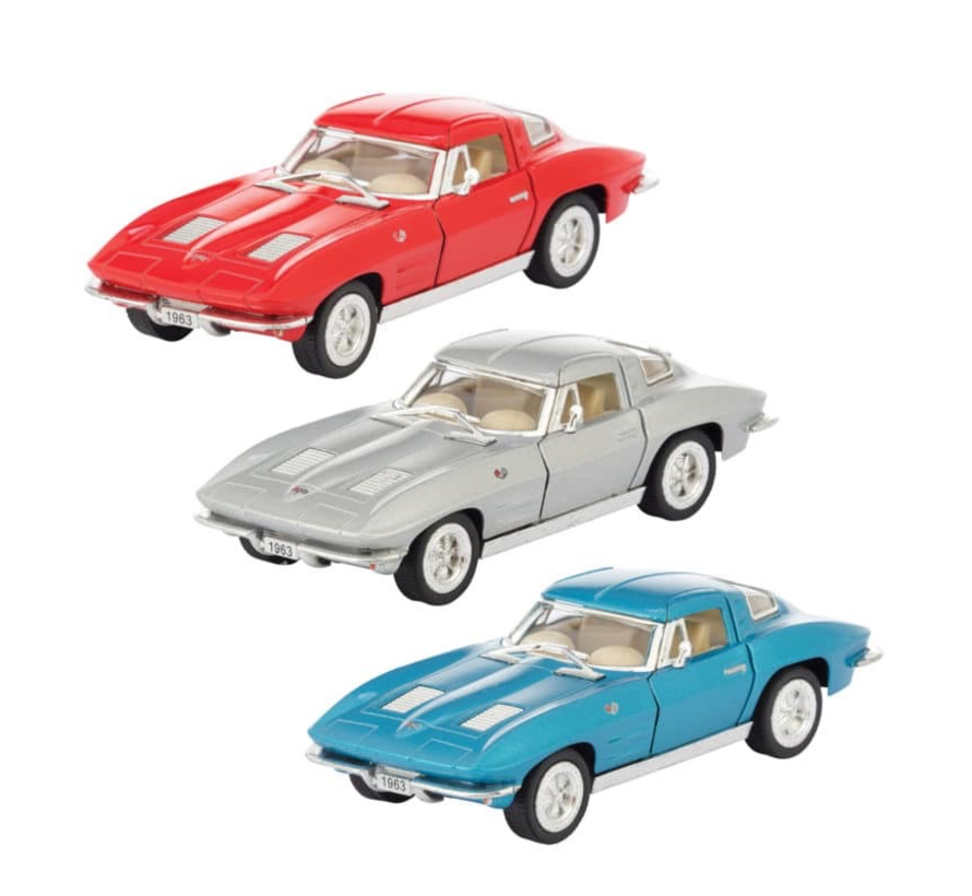 Schylling’s Diecast 1963 Corvette sing ray is made from real metal with a hand painted finish. This officially licensed replica features a pull back motor, Diecast body, and doors that open. Available in assorted colors, each sold separately. Scale 1:34.