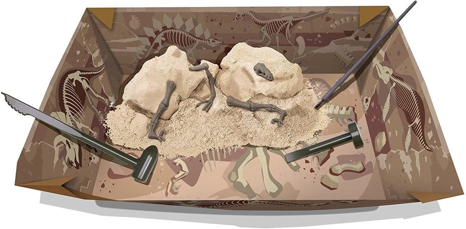 his kit includes a plaster block and a specially designed digging tool to provide hours of fun being a paleontologist