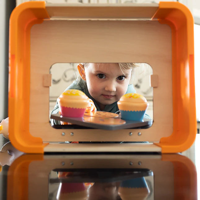 Pretend baking toys with storage crate that doubles as oven