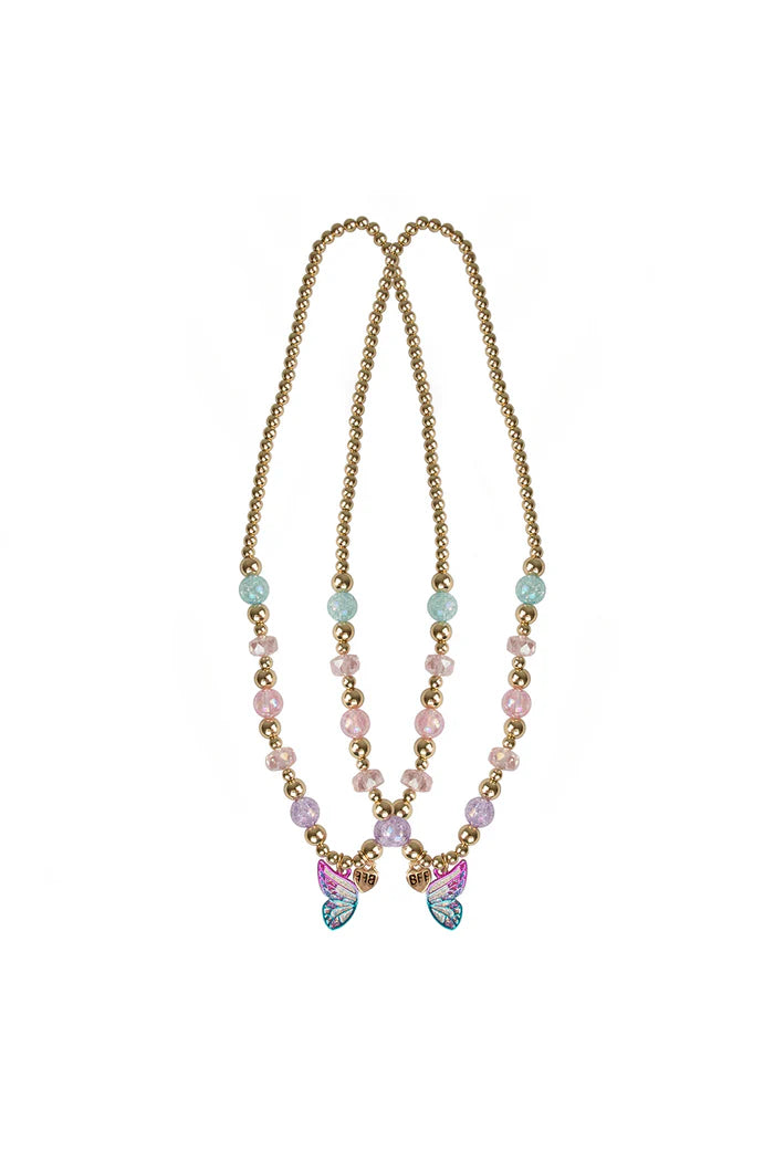 Share the love with your bestie with our Butterfly Wishes BFF necklaces! This set includes two gold toned beaded necklaces, with half a butterfly pendant with a gold BFF heart on each. Our children's jewellery is strung with double the elastic to add extra durability.