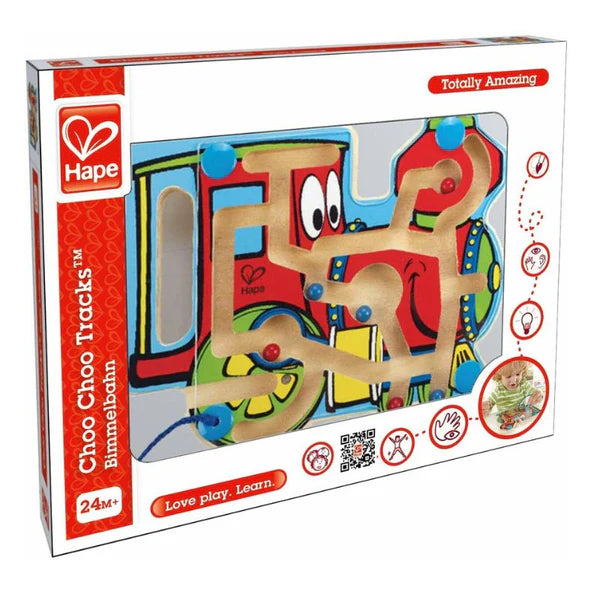 In the Choo Choo Tracks maze by Hape, a magnetic wand tracks marbles through a hand-held maze. All aboard! Use the wand to guide the internal beads to the end of this durable train shaped maze.