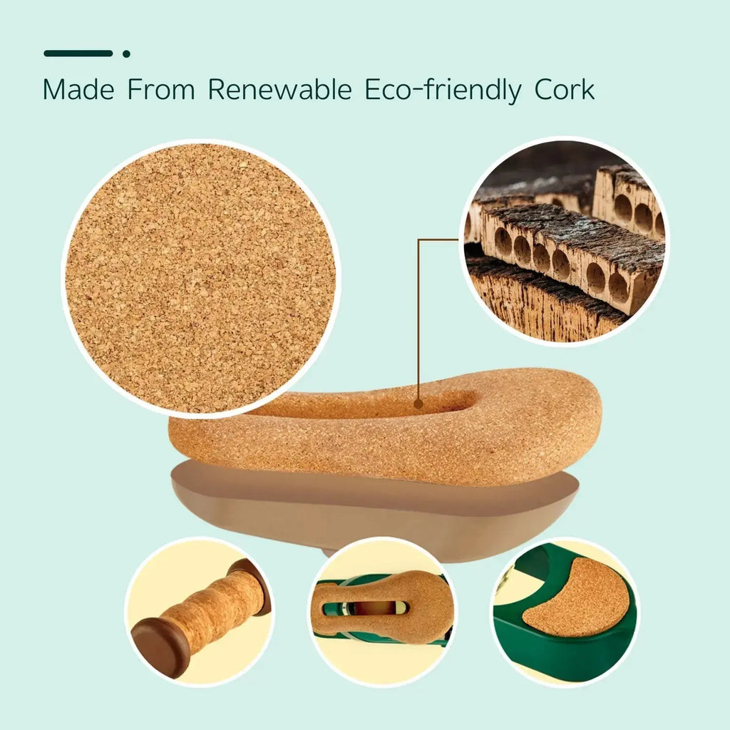 - The handles, footrest and seat are made from cork. This sustainable, eco-friendly alternative to plastic is warm, airy and shock-absorbent
