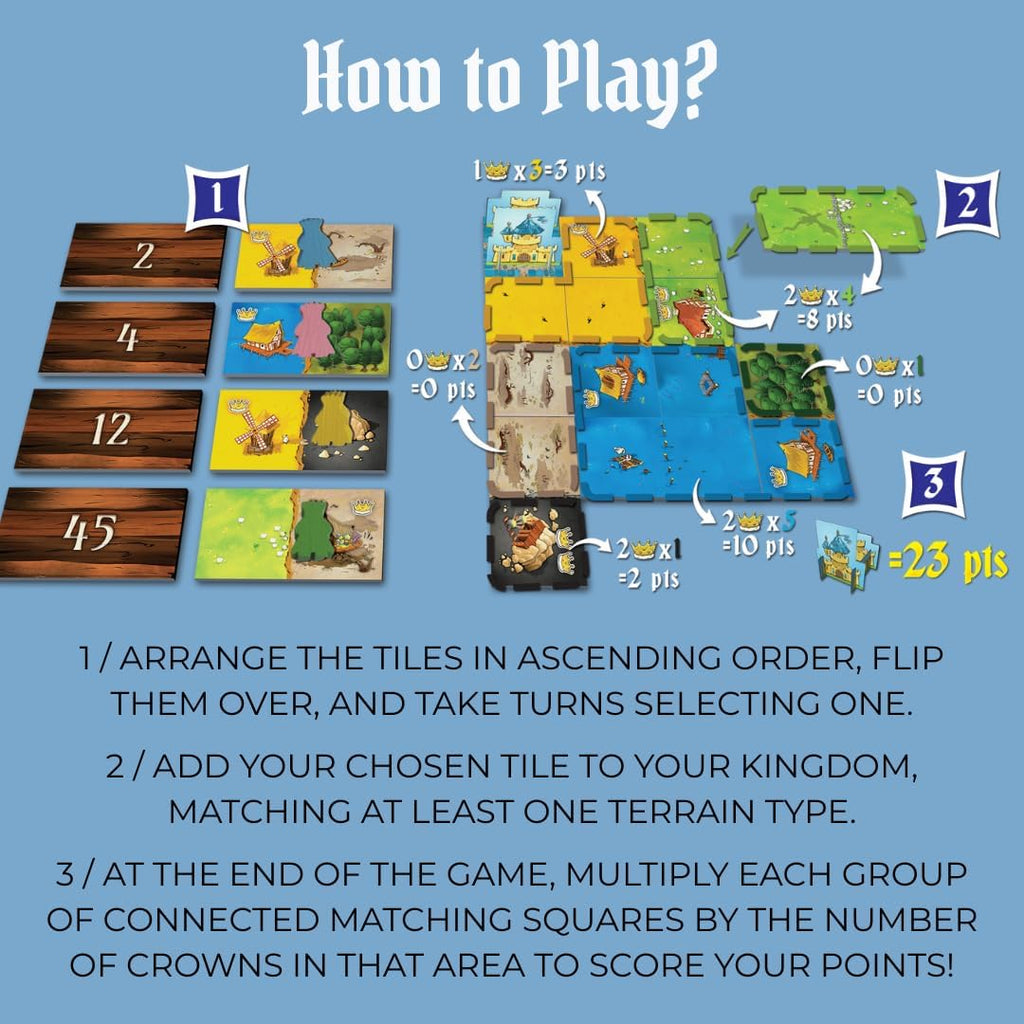 The game uses tiles with two sections, similar to Dominoes. Each turn, each player will select a new domino to connect to their existing kingdom, making sure at least one of its sides connects to a matching terrain type already in play. The order of who picks first depends on which tile was previously chosen, with better tiles forcing players to pick later in the next round. The game ends when each player has completed a 5x5 grid (or failed to do so), and points are counted based on number of connecting tiles and valuable crown symbols.