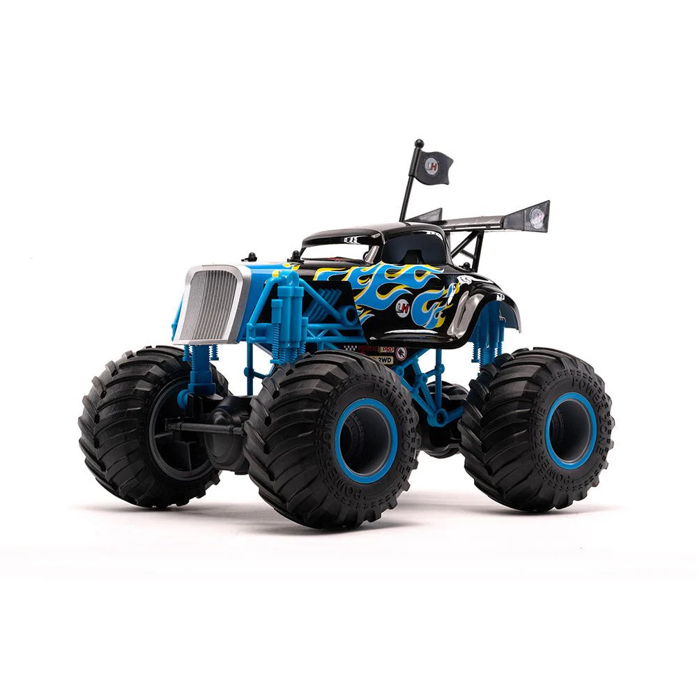 Each Monster Truck in the WHEELERS line of product come stylized with their own unique colours, drivers, sticker sets, and more! Designed with fun in mind, they are outfitted in bright colours with awesome designs and epic drivers. WHEELERS are a blast to drive around, indoors or out. HENRY'S HOT ROD style is modeled after the hot rodding V8 muscle of the past but channelled into the car crushing size and force of a monster truck. Henry's Hot rod is blazing a trail to glory!