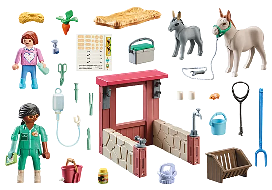 Figure: 1x woman, 1x girl; Animals: 1x donkey, 1x donkey foal, 1x hamster; Accessories: 2x wooden wall, 2x posts, 2x roof support, 2x fence wooden posts, 2x stone wall wall, 1x straw inlay, 1x water tap, 1x bucket square, 1x basket, 1x bucket, 1x feed rake, 1x halter for donkey, 1x hay bundle, 1x calf bucket, 1x pitchfork 1x food bowl, 1x spray bottle, 1x jar with lid, 1x cosmetic bottle, 3x bandages, 1x stethoscope, 1x turnip with turnip weed, 1x infusion bottle, 1x hose for infusion bottle, 1x surgical instruments 4-pcs