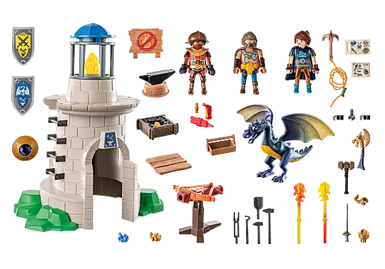 Come into the exciting adventure world of Novelmore and experience thrilling knightly adventures. The age-old rivalry between the Burnham Raiders and the Knights of Novelmore reignites. A fiery raider attempts to take over the Novelmore forge. However, Gwynn and the blacksmith bravely confront him. With creative weapons, cunning defence systems, and original characters, the knights play world of PLAYMOBIL invites to ever-new role-playing scenarios. A great gift or souvenir for knight enthusiasts aged 4 and up. The playset includes three PLAYMOBIL figures, a dragon, a tower with flame, a landing platform, dragon stones, and many other knightly extras.