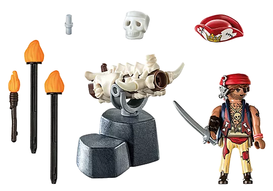 Beware, ye landlubbers! The fierce pirate loads his bone cannon and drives away all attackers and sea monsters with his fiery projectiles. A fantastic playset for all pirate fans aged 4 and up. The bolt cannon is mounted on a rock and can be rotated and swiveled. Bracelets, leather cuffs, and a headband can be removed from the figure.