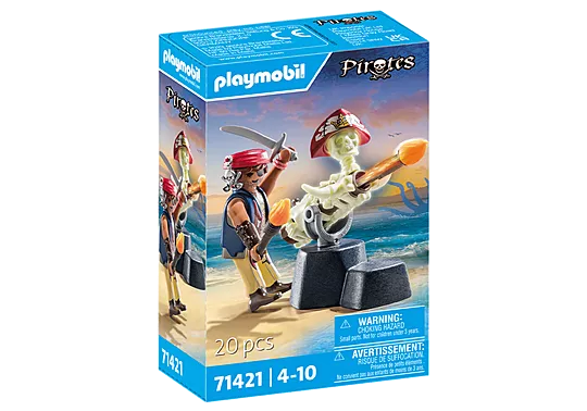 The rotating and pivoting skeleton cannon of the pirate gunner is ready to fire and never misses its target. Includes skeleton elements that glow in the dark.