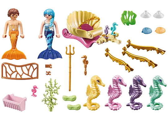 Figures: 1 mermaid, 1 merman Animals: 4 large seahorses, 3 small seahorses; Accessories: 1 underwater carriage, 1 fence, 1 feed reck, 1 trident, 1 seahorse receptacle, 1 hair blossom, 2 bundles of grass, 1 grass, 1 coral, 2 decorative shells with suction cup