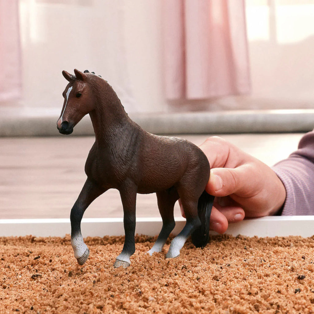 The KWPN gelding is highly focused. He is in the middle of a competition and wants to show what he can do in dressage. He has been rehearsing his piaffe for a long time, and now he finally performs it with pride. The white contrasting coat over the hooves emphasises the stride particularly well. The gelding holds his neck in an elegant arch and shows off his beautiful braided hairstyle. He is sure to win the prize!
