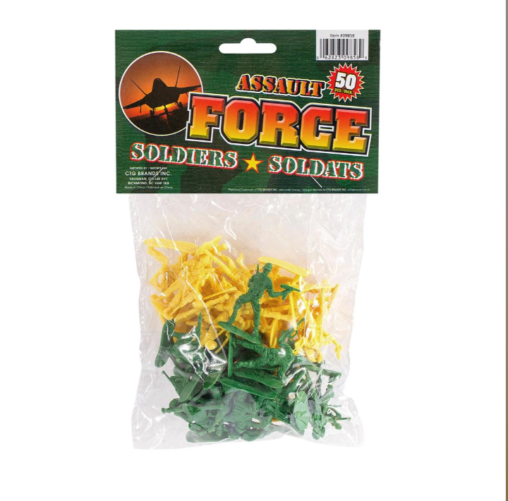 This 50 piece set of plastic miniature soldiers consists of an army of assault force soldiers in classic army green & yellow. This set has spanned generations of play for kids who love to recreate combat and battlefield action!