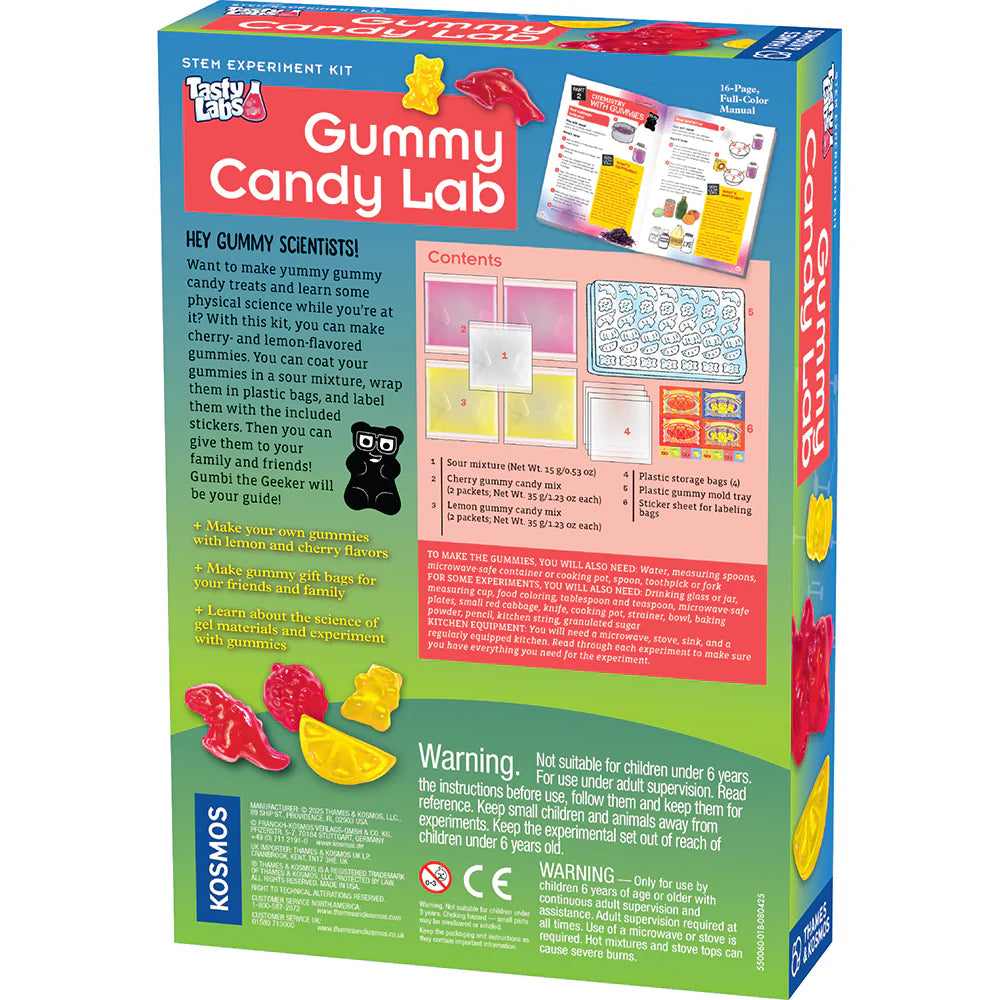 Gummy bears, lemon slices, dolphins, dinosaurs, and more! Make your own delicious, fun gummy shapes using a gelatin mixture: Pour it into the included mold and personalise your gummy creations. You can even add citric acid to make sour gummies. A specially designed recipe and custom tooling help ensure successful results and great-tasting gummies in two yummy flavours: red cherry and yellow lemon. Bonus: Learn about the scientific properties of natural polymers as you mix up these delicious treats! This kit includes all the food ingredients needed for a yummy-gummy good time.